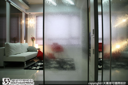 進入客廳前,再立一扇晶瑩的雕花玻璃隔屏稍作界定,無形中也讓動線的行進更有層次。另外,客廳沙發後方就是臥室,設計者以並列的長條狀茶色玻璃搭配捲簾替換實牆隔間,空間也會明顯放大許多。