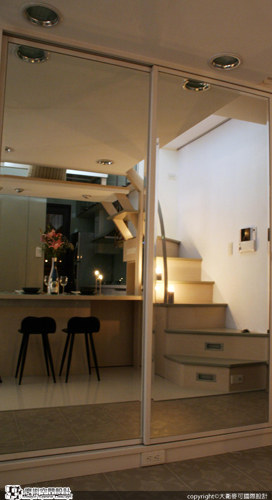 開放感十足的隔間方式 營造居住環境的開闊感,很重要的一件事就是減少實體隔間、增加空間的穿透力。玄關一進門處,考量上方作為主要夾層區,高度已經減少的前提下,右側的鞋櫃就以兩扇鏡面拉門製作,除了增加視覺擴張的印象,一方面也能整飾衣著、或讓空間更明亮。進入客廳前,再立一扇晶瑩的雕花玻璃隔屏稍作界定,無形中也讓動線的行進更有層次。另外,客廳沙發後方就是臥室,設計者以並列的長條狀茶色玻璃搭配捲簾替換實牆隔間,空間也會明顯放大許多。