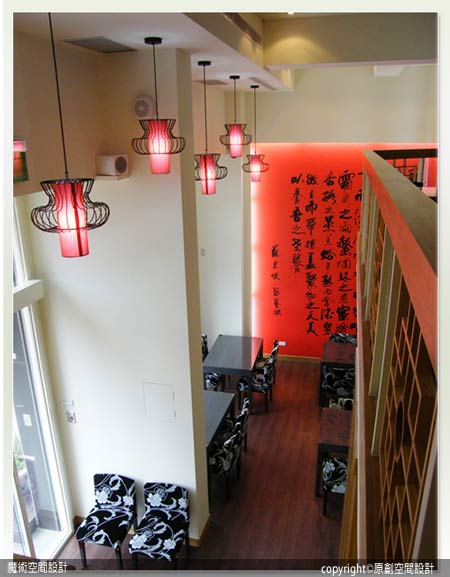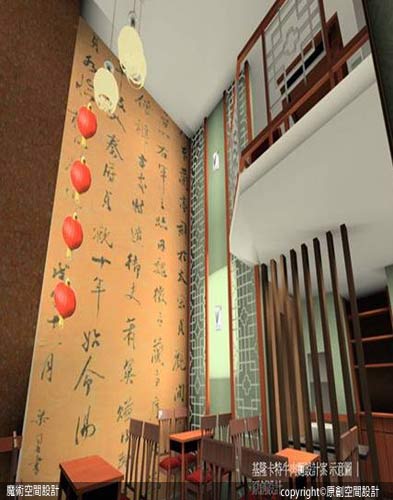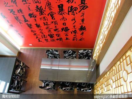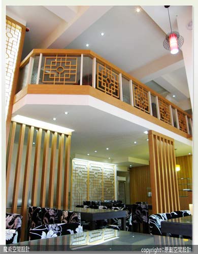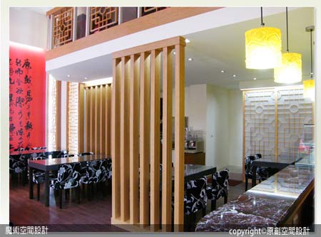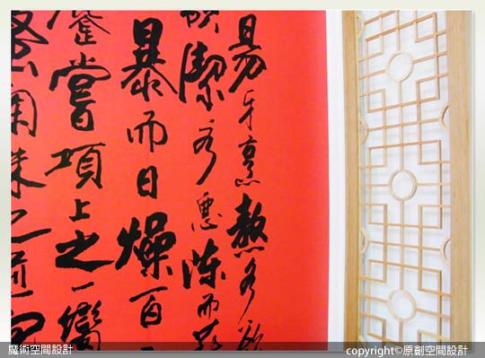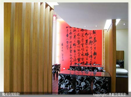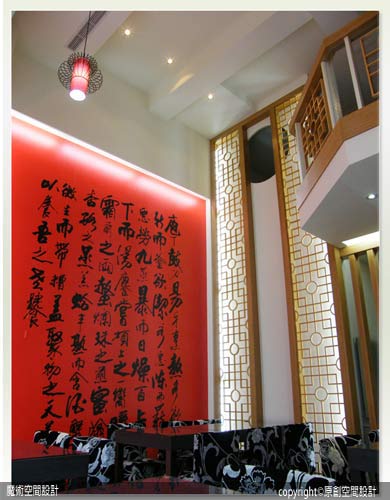 建材使用:C型鋼構夾層樓板、實木窗花、實木格柵、大圖輸出-老饕賦書法