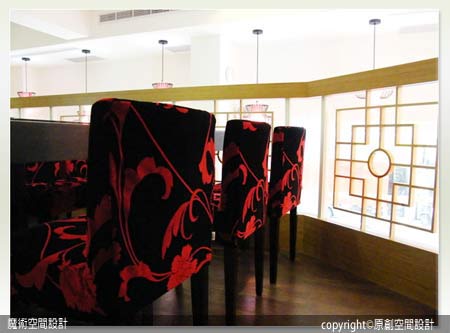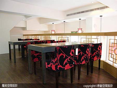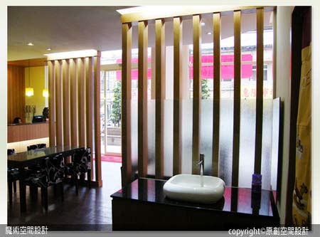 此餐廳裝潢陳設錯落於空間中的中式窗櫺、格柵,不但營造出現代東方風格的古典意涵,也為用餐的賓客提供基本的隱私。原創空間設計師林士翔為了體貼用餐的賓客,特別將洗手檯置放於用餐區,並與空間的元素作結合,明亮且俐落大方。
