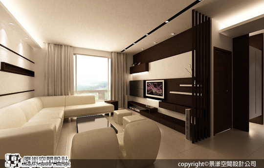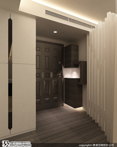 從事裝修設計工作多年來,景漾空間設計師許沛濬認為,室內設計的內涵與使命應該不僅止於解決生活機能與空間美化。由於現代人生活節奏快速,室內設計師如何透過空間規劃,讓屋主與家人得以藉由居家生活的沉澱與休息,迅速充電、甚至獲得更多生命能量以面對每一天挑戰,成為室內設計師更深層的課題。此個案考量屋主為青壯年,無論是生活節奏或者品味風格都偏重都會現代的設計,因此,客廳以簡約而俐落的橫向線條與直向格柵作為設計語彙,搭配電視主牆上染深木色的幾何櫃體配置,呈現出簡直化的現代美感,同時每個櫃體有其機能性與必要性,也完全符合於現代風格設計的原則。天花板刻意以線狀木作搭配嵌燈來取代主燈設計,簡化了空間裝飾元素,也拉高了屋高的比例,讓空間更顯輕鬆、無壓力感。另外,現代風的白色家具則提升空間純淨感,使屋主回到家即能感受沉澱、放鬆的釋放能量。整個設計另一重點在於玄關的地板與屏風,木作的地板搭配參差不齊的格柵線條,為簡約的風格注入更靈活與自然的元素,擺脫一般現代風格過於冷漠的空間感,不僅更具有人文味兒,也讓家人一回到家裡就可擺脫緊張的生活節奏;而這樣的設計概念同樣出現在臥房區,大量的樸實木作感以及明亮、粉嫩色彩的運用,都有助於提升居住環境的能量。