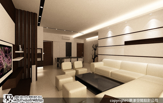 以現代簡約風格設計的觀點將空間的元素盡量簡化,並恪守「形隨機能而生」的設計原則,景漾空間設計許沛濬運用對比的色彩,以及簡單的線條勾勒,將屋主年輕且都會的生活品味放入設計中。在公共空間以現代簡約風格為主軸,使設計內化而更具有層次與內涵;至於私領域的規劃則著重身心靈放鬆,大量採用自然木皮為素材,並且透過更具有生命能量的色彩來滿足屋主需求。