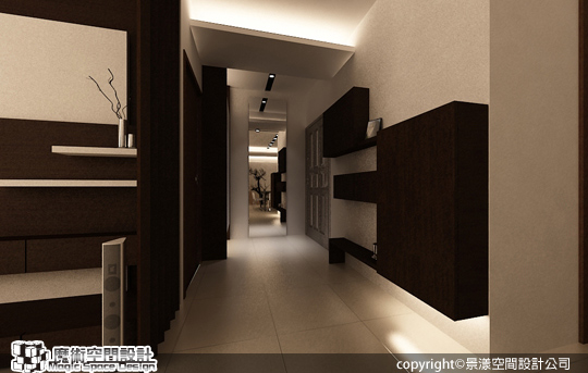 透過鏡面的延伸化解走道區的狹隘感,同時也放大空間的景身效果,讓內外格局更漸區隔性。