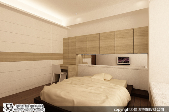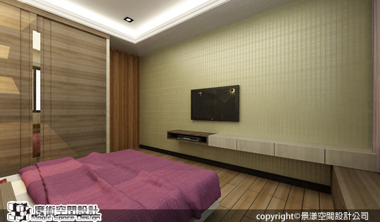 主臥室在設計線條上延續公共區的簡約,電視牆以壁紙鋪陳、搭配線性檯面設計,讓畫面簡潔卻不冷漠。