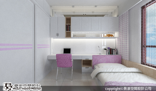 女孩房以務實的單人床設計,讓出更多空間做閱讀區的規劃,而大量的櫥櫃也因白色與粉嫩色彩的搭配而減弱壓力感。