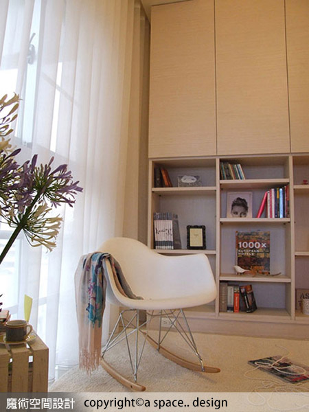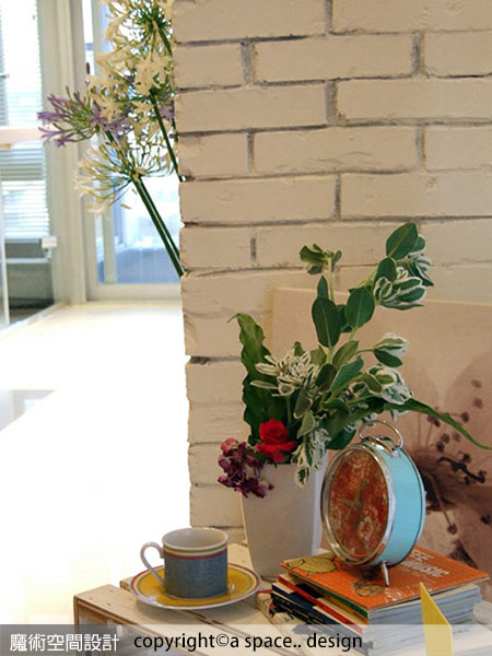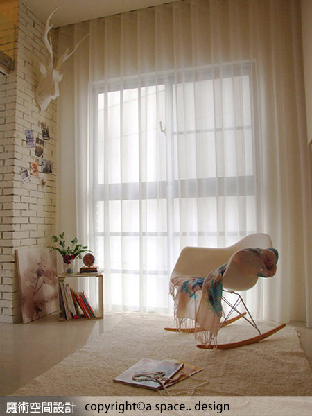 1.a space..design陳焱騰設計師透過媒材的特色,如:白色磚牆、橡木地板、進口白色蛇形簾,將空間妝點得具人文意趣,同時強調空間挑高感受。